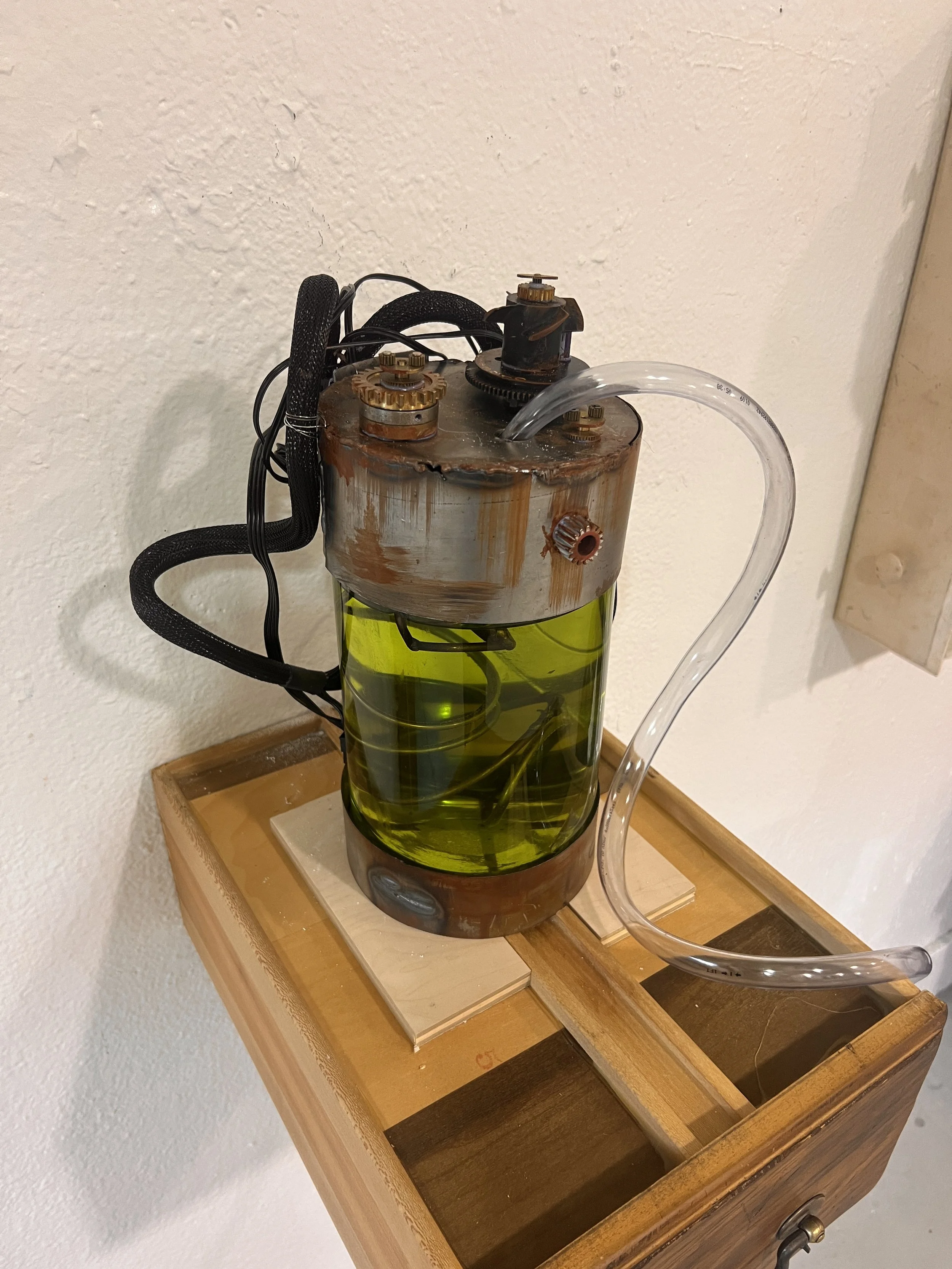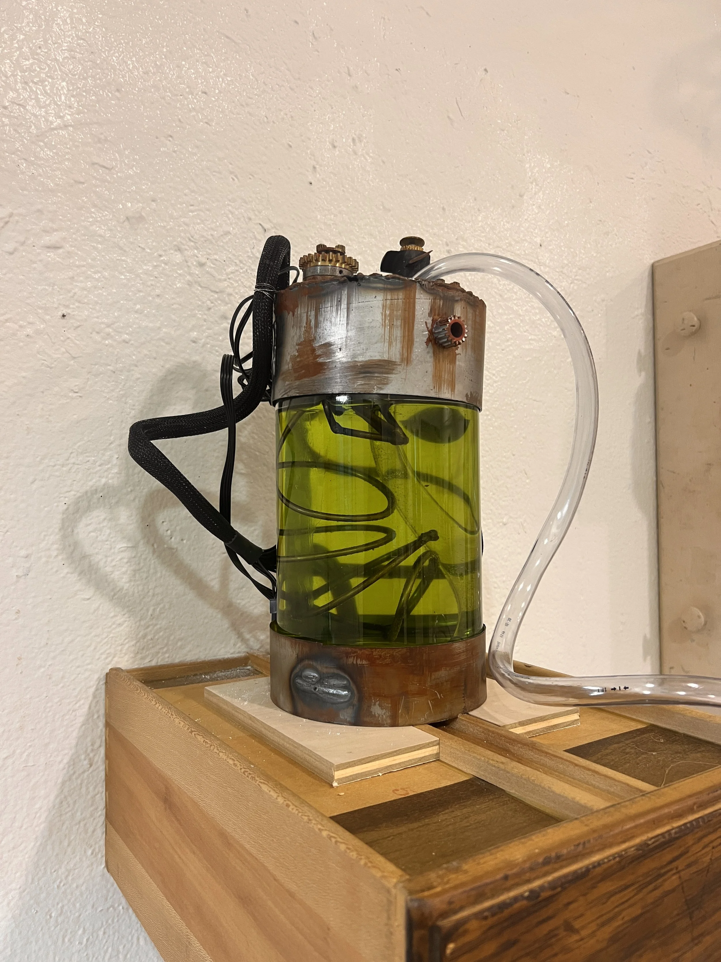 Encased in a pressurized cylinder, the specimen becomes both experiment and prototype. Tubes feed into it, drain from it—unclear if they’re sustaining life or extracting data. The green fluid suggests contamination or mutation, something just on the edge of what we call natural.