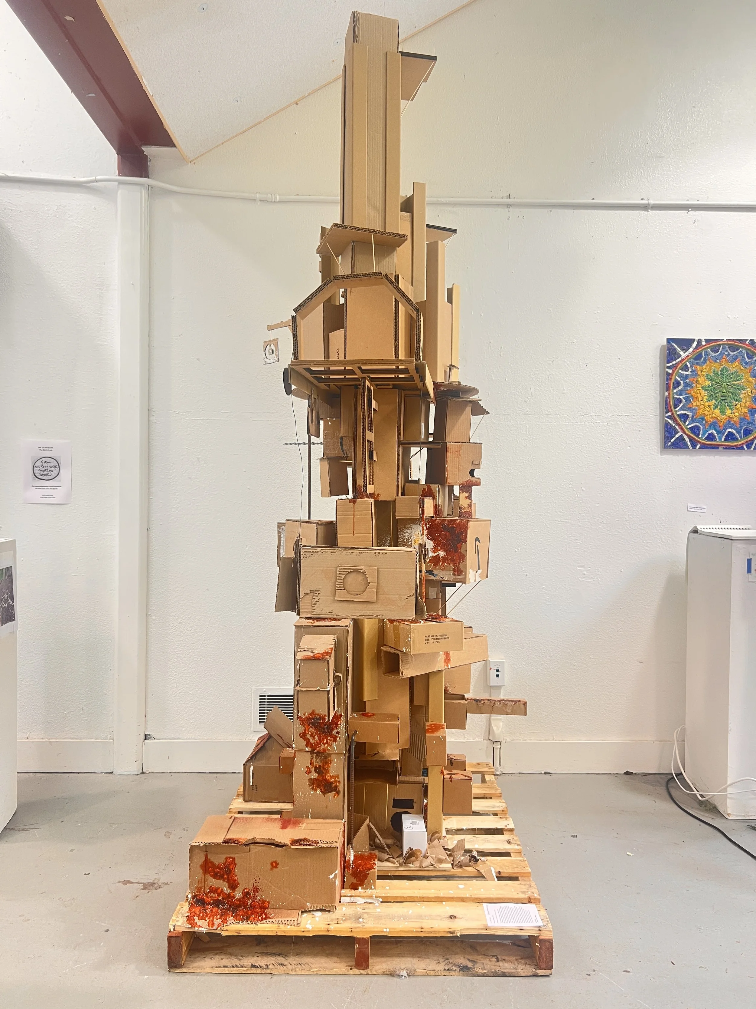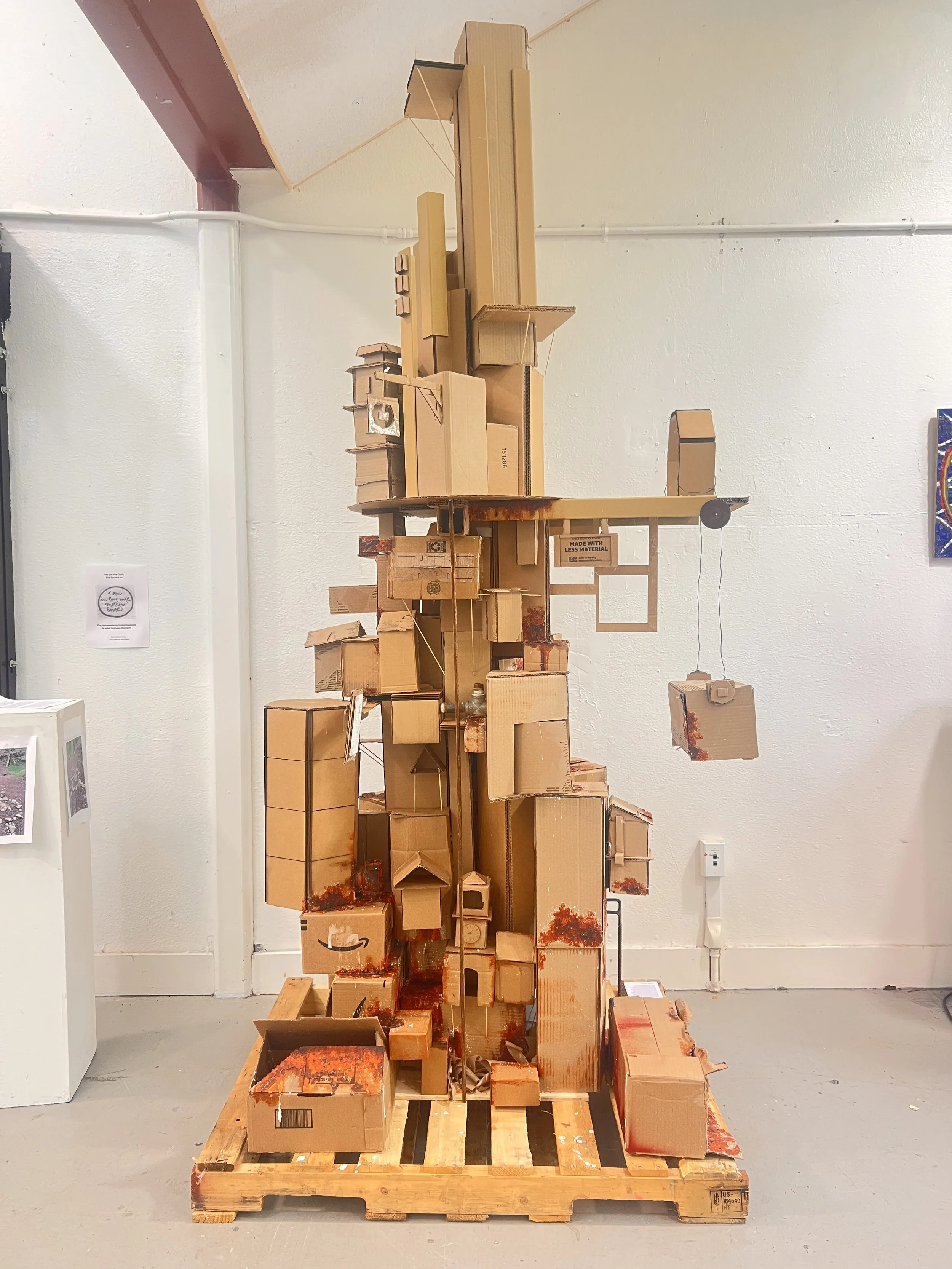 Only placing a module where it would increase structural stability, was one of the constraints the artist placed upon themselves to stay true to the “swarm intelligence” of a city. As the structure grew, amazon boxes happened to be the easiest and most abundant material the artist could find. There is a clear divide between the levels, as is true in most vertical structures.