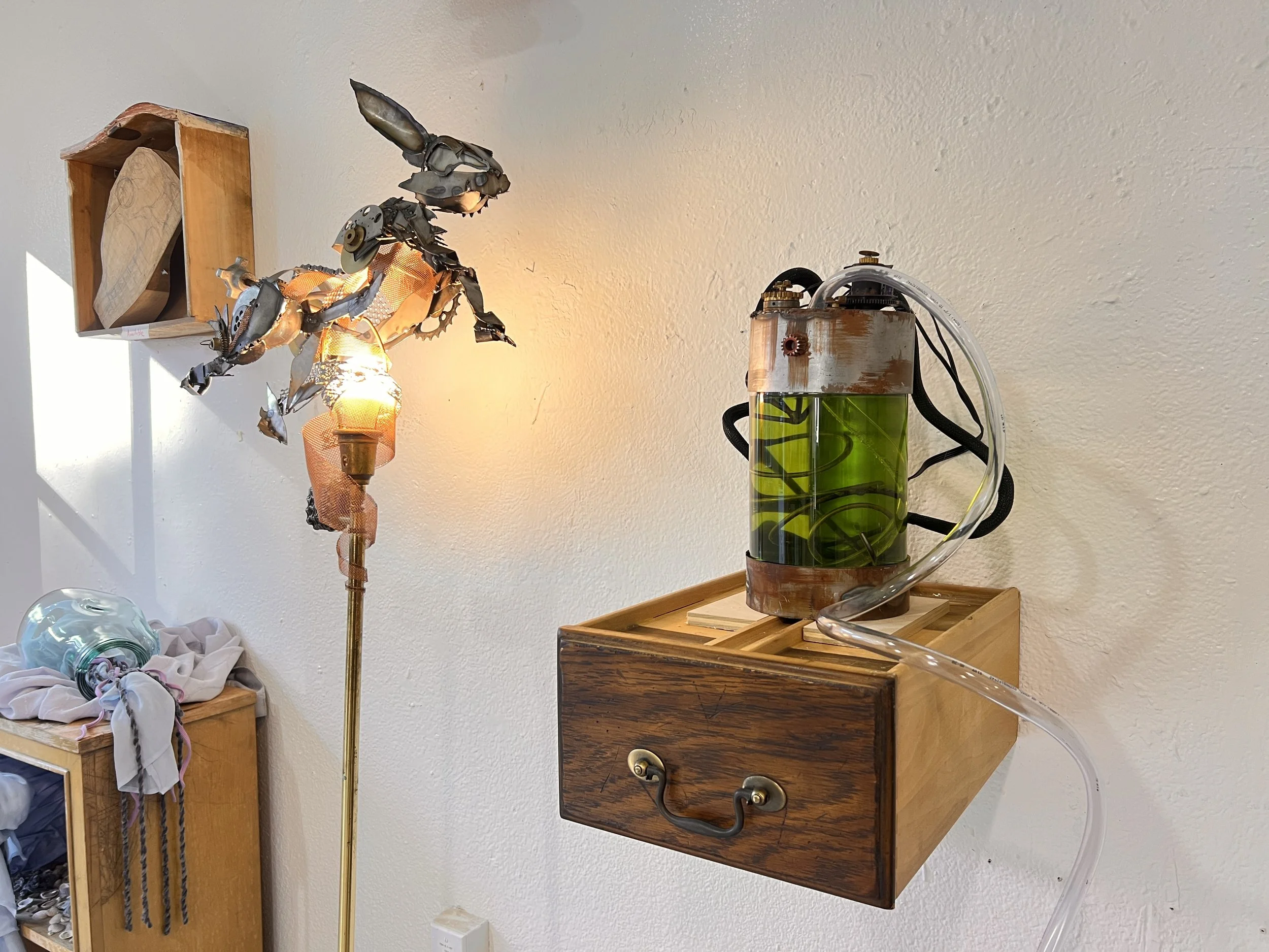 In a desperate attempt to undo the damage of a ruined Earth, scientists turn to the one creature that never dies: the cockroach. This interactive sculpture envisions a speculative future where humans, fractured by ecological collapse and poisoned cities, begin bioengineering roaches to study and replicate their resistance to radiation, toxicity, and time.